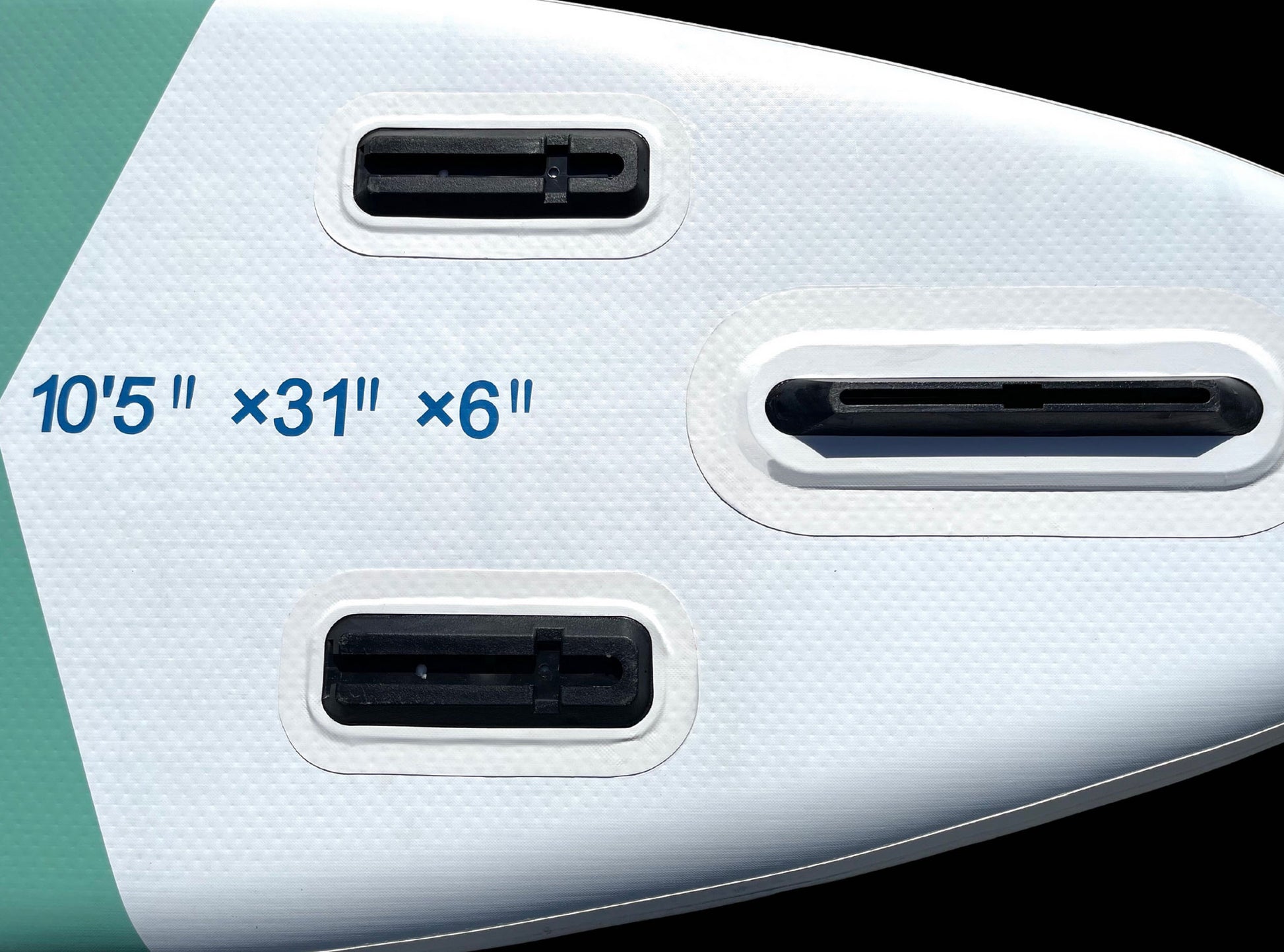 The 10’5” length, 31” width and three-fin setup keep it gliding efficiently, tracking straight, and easy to turn. The 6” thickness makes the board stable, rigid and able to hold a surprising amount of weight.