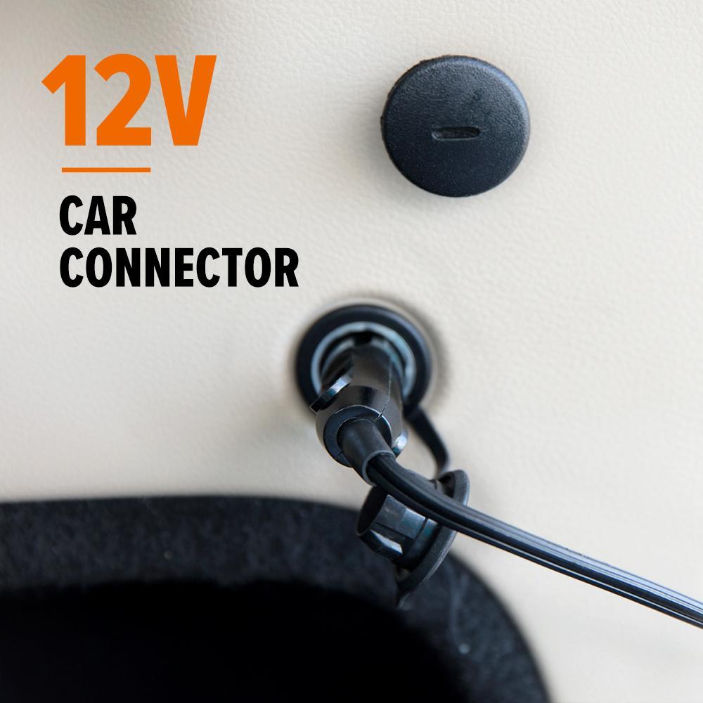 The 9ft long power cord connects to your cars 12V DC connector. Features a 12A fuse for increased safety.